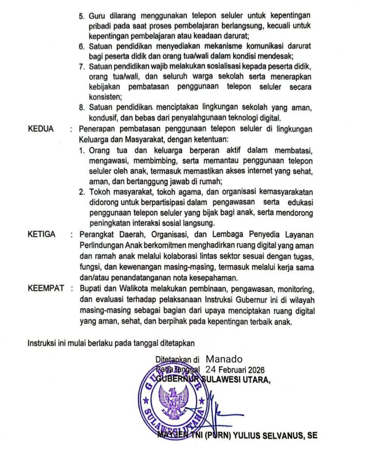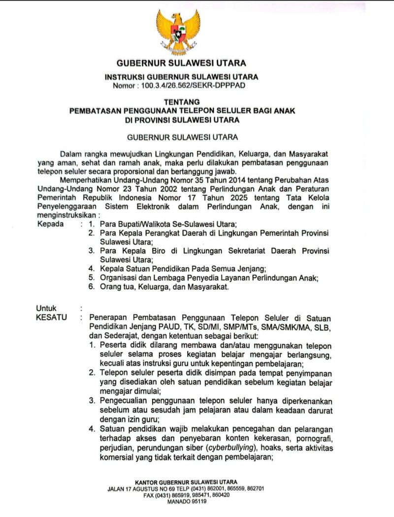 Kebijakan tersebut dituangkan dalam Instruksi Gubernur Sulawesi Utara Nomor 100.3.4/26.562/SEKR-DPPPAD yang mengatur pembatasan penggunaan ponsel oleh peserta didik di seluruh satuan pendidikan di daerah ini.