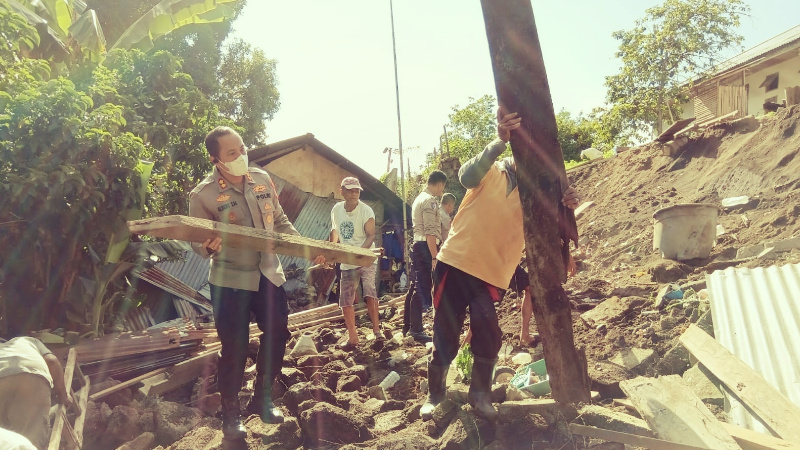 Di Kelurahan Manembo-nembo Tengah Kecamatan Matuari, Kapolres bersama personel terlibat dalam pembersihan puing-puing tembok yang roboh dan menimpa dapur rumah milik keluarga Siahaya Kakombohi.